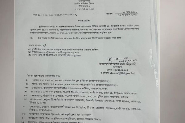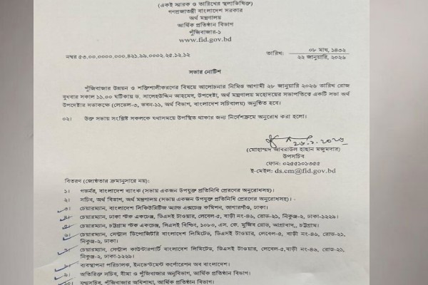 অন্যদিকে একই উপসচিব হাছান মজুমদারের সাক্ষরিত আরেকটি নোটিশে শেয়ারবাজার নিয়ে বৈঠকের কথা বলা হলেও তাতে ‘ডিএসই ও সিএসই একীভূত করা, সিডিবিএলকে শেয়ারবাজারে তালিকাভুক্ত করা এবং সেন্ট্রাল কাউন্টার পার্টি বাংলাদেশ লিমিটেডকে (সিসিবিএল) ডিএসইর সাবসিডিয়ারি হিসেবে অন্তর্ভুক্ত করার’ এজেন্ডা উল্লেখ নেই।