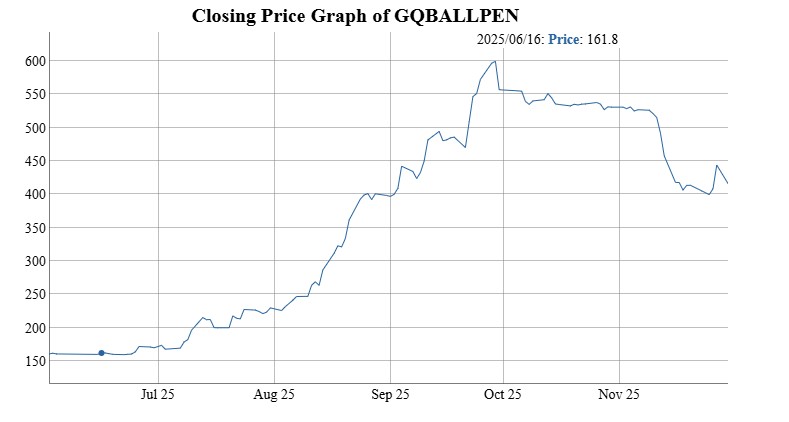 টানা লোকসানে থাকা জিকিউ বলপেনের শেয়ার দর গত ২৫ জুন ছিল ১৬৩.৫০ টাকা। যা টানা বেড়ে ২৮ সেপ্টেম্বর উঠে যায় ৫৯৬.৭০ টাকা। এক্ষেত্রে দর বাড়ে ৪৩৩.২০ টাকা বা ২৬৫ শতাংশ। এই দর বৃদ্ধির পেছনে কোন যৌক্তিক কারণ খুঁজে পায়নি ডিএসই কর্তৃপক্ষ। তবে শেষ কিছুদিনের পতনে শেয়ারটি এখন ৪১৬.১০ টাকায় নেমে এসেছে।